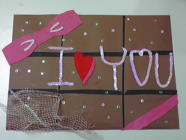 バレンタインをテーマにYちゃんは貼り絵を完成、キラキラな文字が可愛いですね~