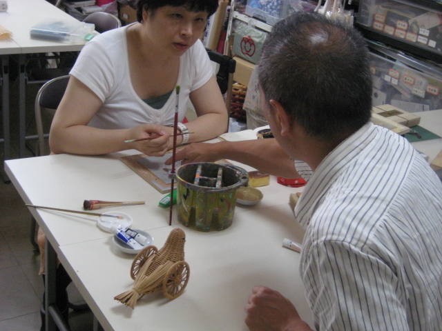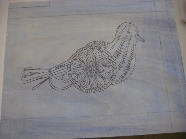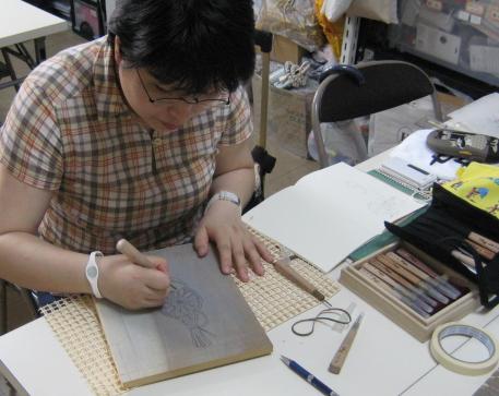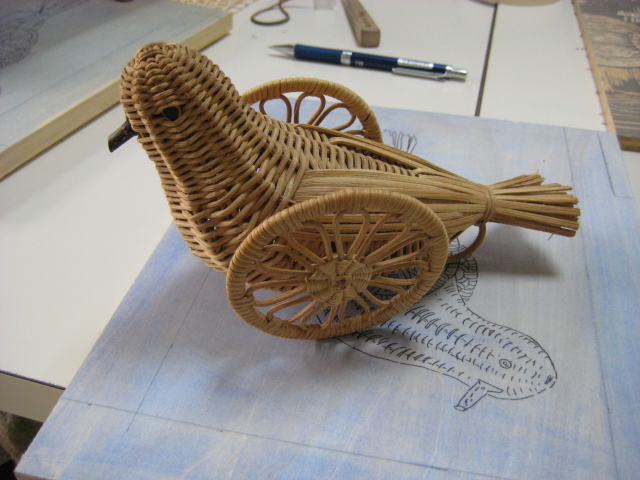 今回は鳩車です、藤で編んだ感じを上手く彫り跡で表現出来るかがポイントです。