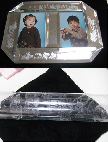 上: 写真立てに花模様、鏡になっていて彫るのが難しいです。