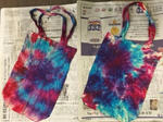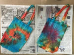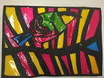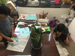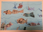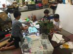 Hくんは染の柄が移った新聞紙を魚の形に切ってペタペタ!