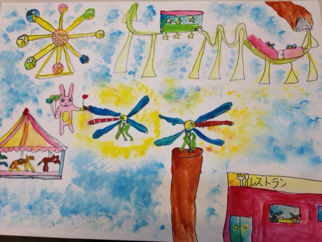 Aちゃんは夕焼け空トンボ Rちゃんは遊園地をバックに描きました