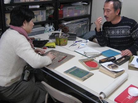2時から 木版画の初回 と デッサンの体験 同時に始まりました。 木版画は阿倍野で体験していただき 香里園での開講に快諾していただきました。 初めての木版画なので モチーフを相談して 取り掛かったところです。