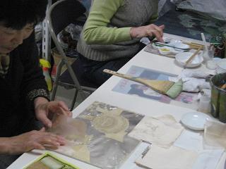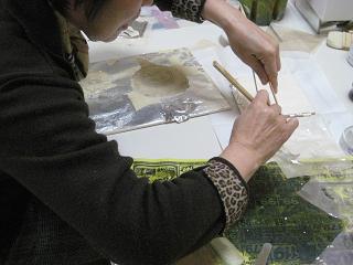 あけましておめでとうございます。 本年も宜しくお願い申し上げます。 今日は4名様が受講されました。 うちHさんが初めて銀箔貼りをされました。 丁寧に慎重に・・・ ついでに? Yさんは金泥を初塗りされました。 初めての経験で楽しんでおられました。 次の展開が楽しみです(^^)