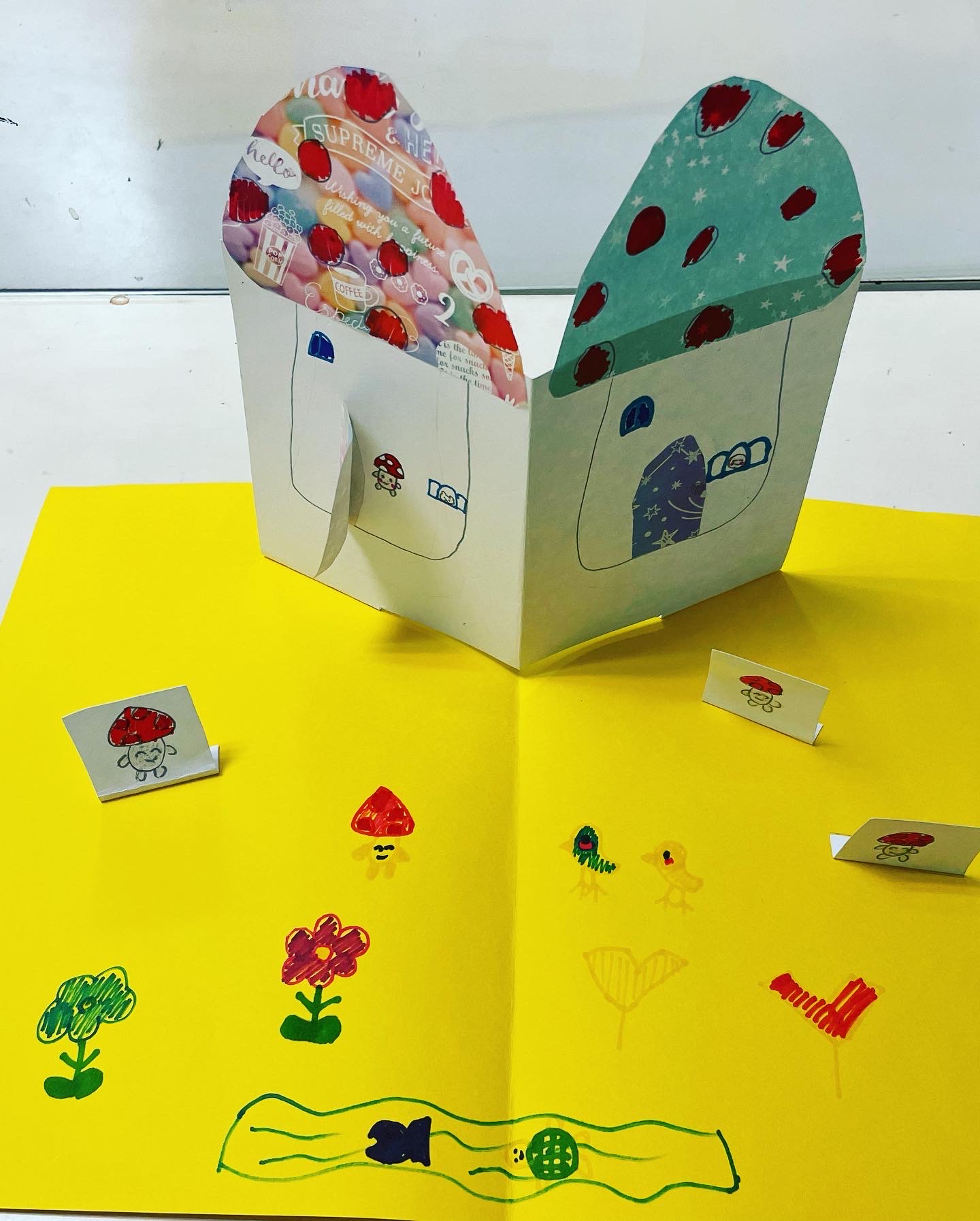 Mちゃん、キノコのお家を作りました。
