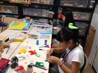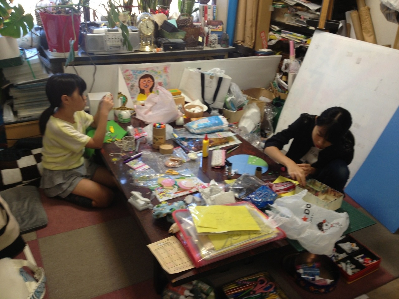 Rちゃんは鳥を、Sちゃんはヤシの木を制作中です