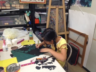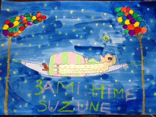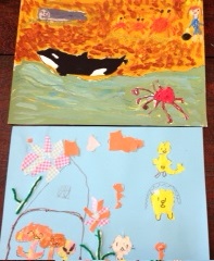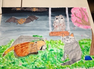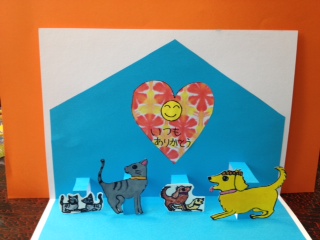 Rちゃんは、とっても可愛い犬と猫の親子を描きました、ハートも効いてます‼